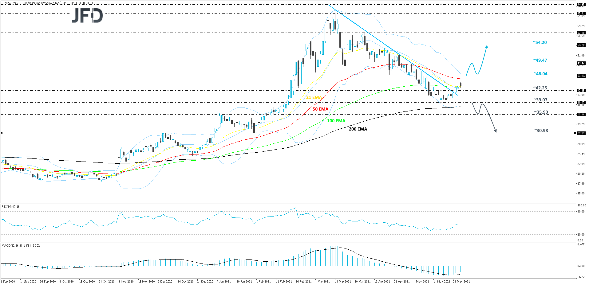 Alternativamente, si el precio de la acción cae completamente por debajo del mínimo de mayo, en 39.07, esto podría asustar a nuevos compradores por un tiempo, ya que la acción confirmaría un próximo mínimo más bajo. TRIP puede deslizarse hacia el obstáculo de 35,90, marcado por el máximo del 27 de enero y el mínimo del 10 de febrero, donde el precio de la acción podría estancarse por un momento. Dicho esto, si todavía no hay nuevos compradores a la vista alrededor de ese precio, TRIP podría terminar cayendo hasta el nivel de 30,98. Ese nivel marca el mínimo del 29 de enero.