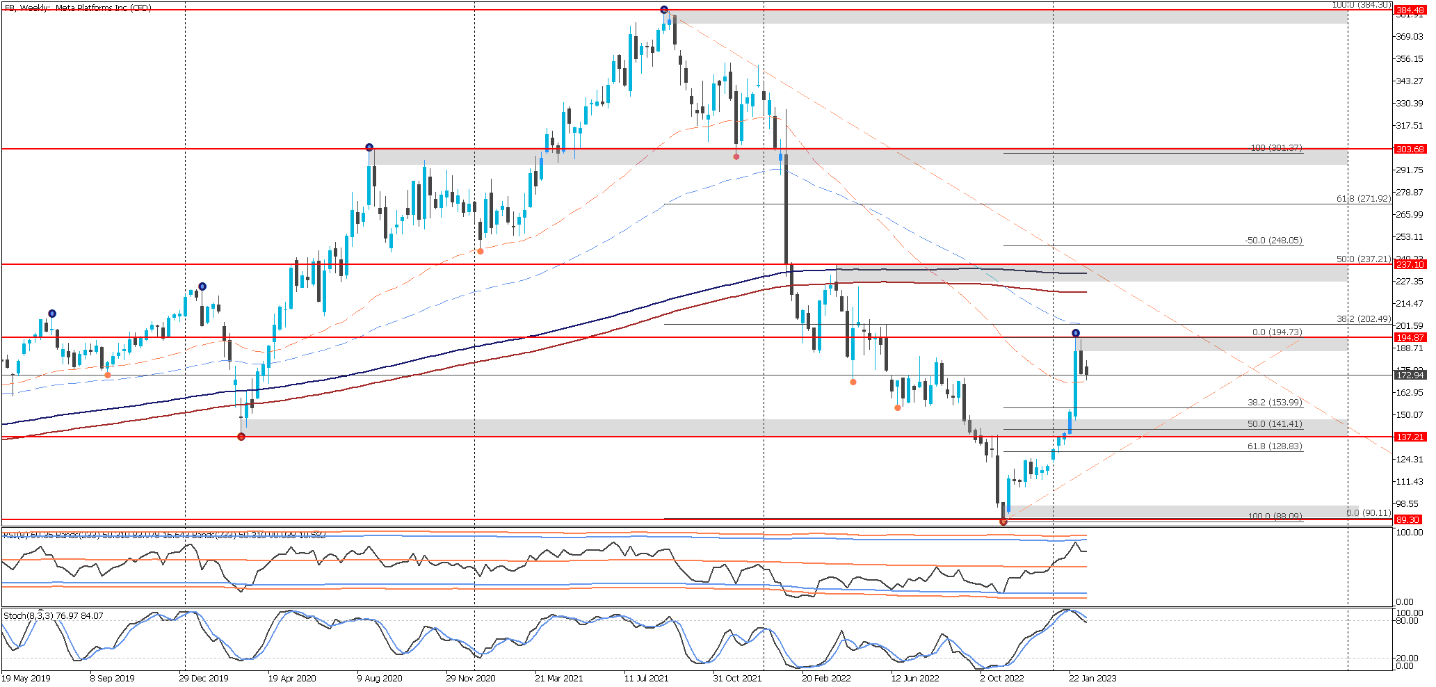 Gráfico de META (FB)– W1 - JFD Brokers – Metatrader 5 (20/02/2023) - El trading es arriesgado. El rendimiento pasado no es indicativo de resultados futuros