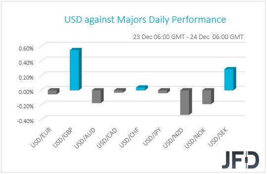 Hoy es Nochebuena y no recibimos ninguna publicación de datos significativa. La mayoría de los principales mercados bursátiles estarán cerrados o tendrán un cierre anticipado. Los índices alemán DAX y Euro Stoxx 50 se cerrarán, junto con los mercados escandinavo e italiano. El Reino Unido y los EE. UU. Tendrán un cierre temprano, ya que permitirán a los comerciantes capturar algunos últimos intercambios antes de Navidad.