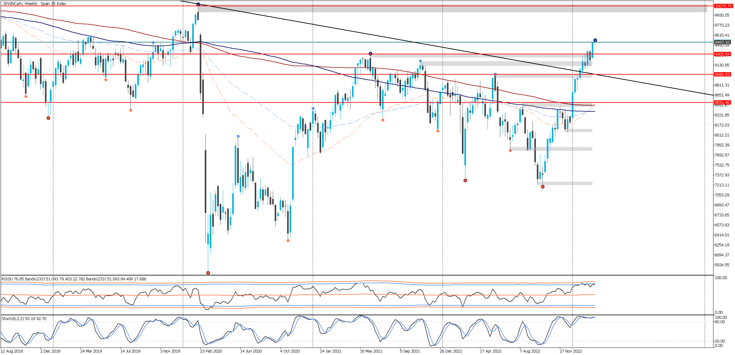 Gráfico del índice IBEX35 (.SPAINCash) – W1 - JFD Brokers – Metatrader 5 (06/03/2023) - El trading es arriesgado. El rendimiento pasado no es indicativo de resultados futuros