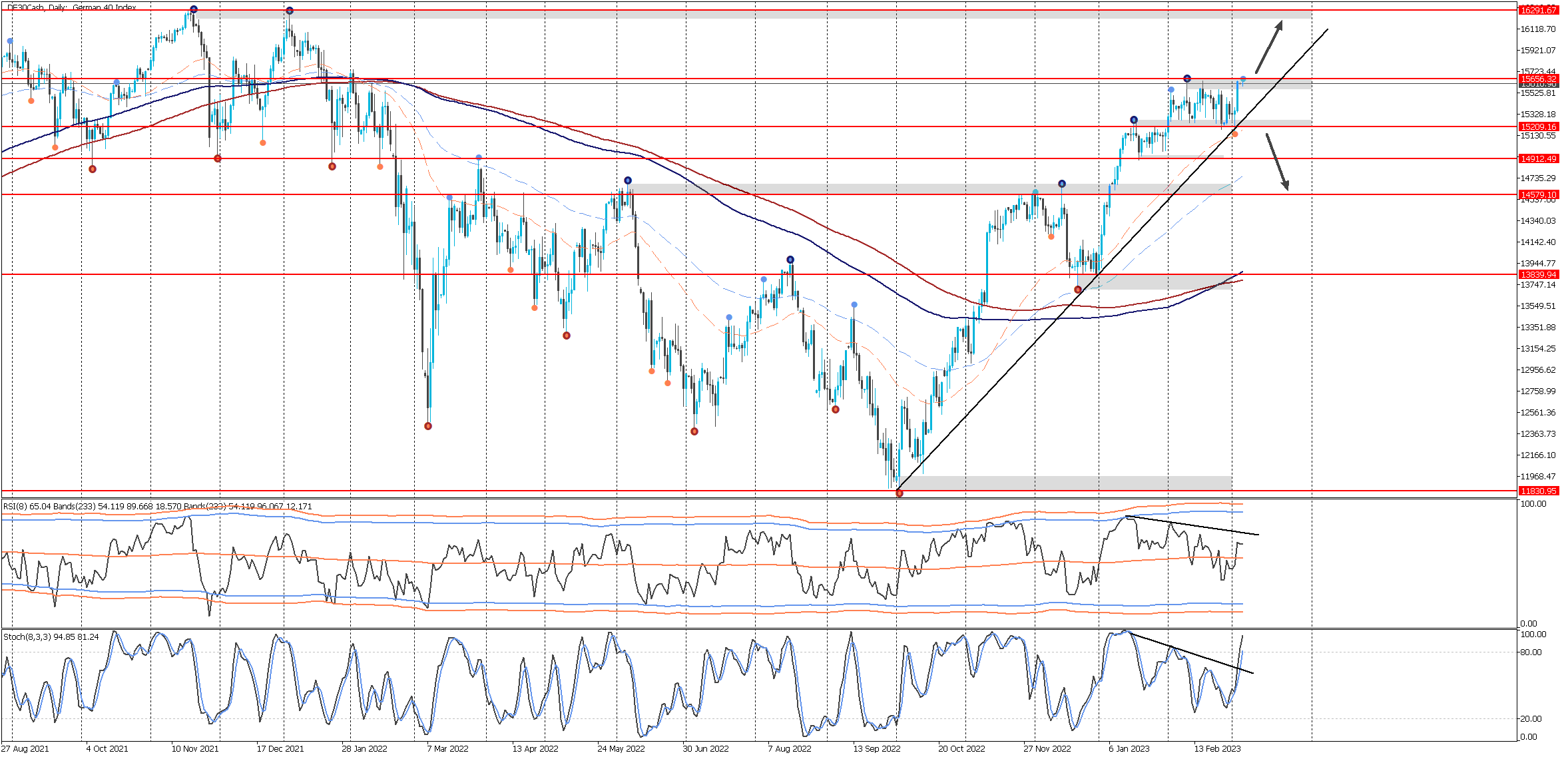 Gráfico del índice DAX40 (.DE30Cash) – D1 - JFD Brokers – Metatrader 5 (06/03/2023) - El trading es arriesgado. El rendimiento pasado no es indicativo de resultados futuros.