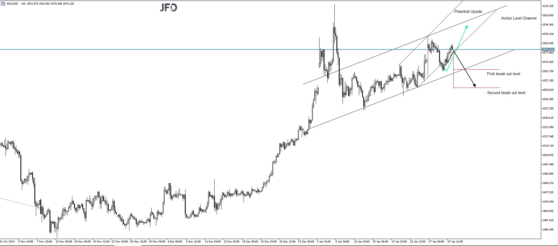 Visión alcista: el precio continúa subiendo en busca de la parte superior del canal, lo más probable es que veamos un retroceso en 1.576 USD donde puede probar una línea de soporte anterior. Nuestro objetivo alcista se encuentra al final del canal en 1.596 USD, también tenga en cuenta que el área de 1.600 USD también es un área psicológica donde debería haber muchas órdenes pendientes.